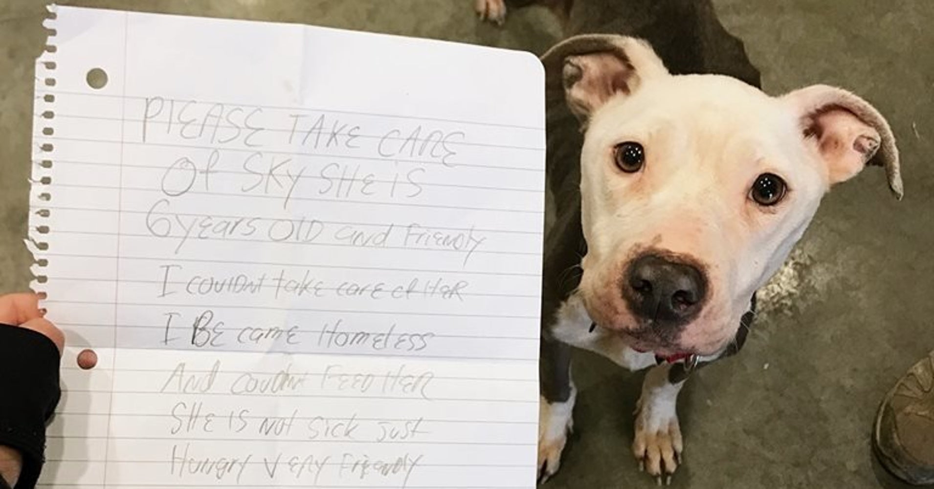“Please take care of Sky,” reads the handwritten note, seen in a photo posted to Facebook by the Delaware Humane Association on Thursday. “She is 6 years old and friendly. I couldn’t take care of her. I became homeless and couldn’t feed her. She is not sick, just hungry. Very friendly. Please find her a home please.”